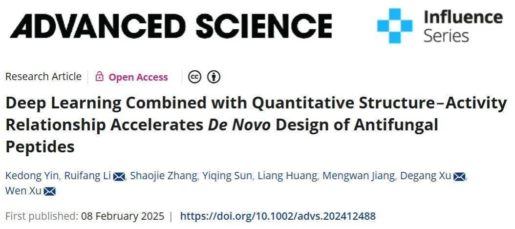 近日,我校生物工程学院李瑞芳教授团队在国际顶级跨学科学术期刊《Advanced Science》(中科院一区TOP,IF=14.3)上发表了题为“Deep Learning Combined with Quantitative Structure‒Activity Relationship Accelerates De Novo Design of Antifungal Peptides”(DOI: 10.1002/advs.202412488)的研究论文。硕士研究生尹柯栋为第一作者,李瑞芳教授为第一通讯作者,betway在线官网为唯一署名单位和通讯单位。